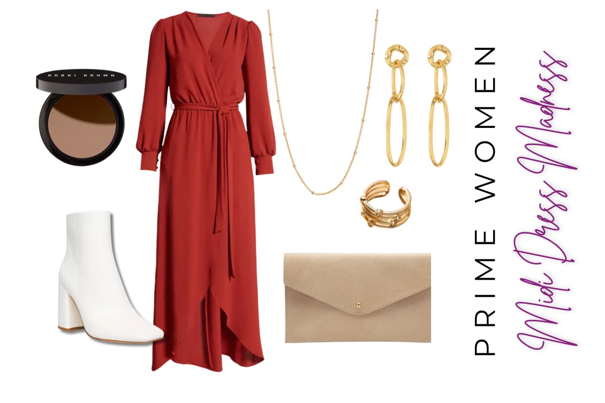 Dress, $105 | White Ankle Boots, $20 | Necklace, $115 | Ring, $44 | Earrings, $22 | Bronzer, $47 | Clutch, $51