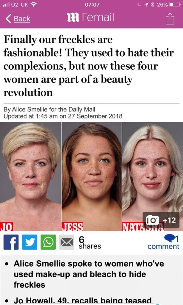 And finally, after a two-week wait (hence not being able to write about it until now) the article was printed in the Daily Mail, on Thursday 27th September – Page 48! There I was, the first picture, the slightly bigger picture of the 4, with no makeup for all the world to see. OMG! The article is amazing and I’m so proud to have put freckles back into fashion — go me! (And the other ladies, of course!)