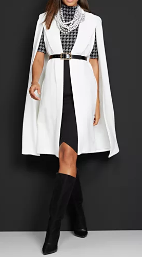 Another great look that is tres chic is a belted cape with leggings or a pencil skirt and knee-high boots.