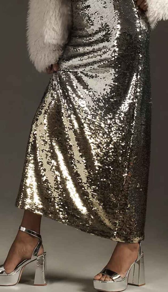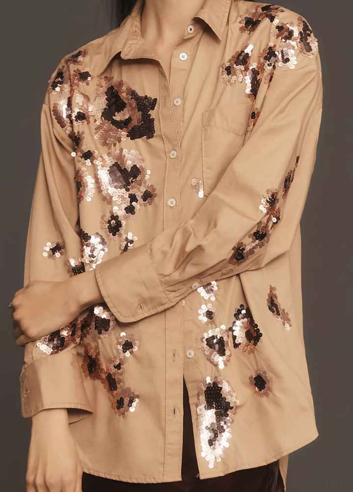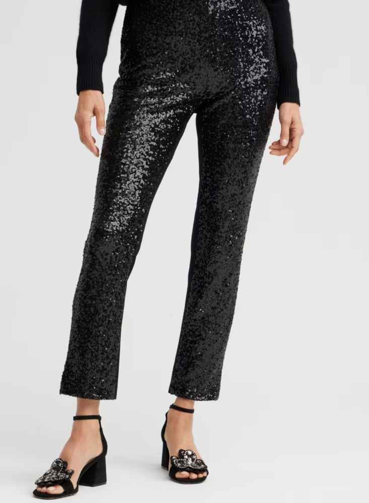 Our favorite sequin bottom is the pencil skirt. Pair them with super soft, over sized sweaters to dress them down to daytime. To keep it modern, tuck two-finger’s worth of the front hem of the sweater into the skirt’s waistband, which will also emphasize the slimming effect of a pencil skirt. The fun Hawaiian print below adds a chic retro flair and would look great with rusts and chocolates in your other wardrobe choices. If the grocery store is your only destination, there is no reason to look like a frump when you could just throw on the sequin joggers, a crisp white blouse and a pair of fashion sneakers.