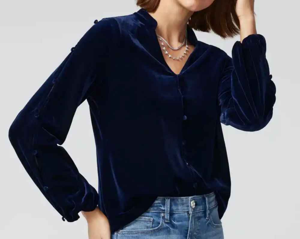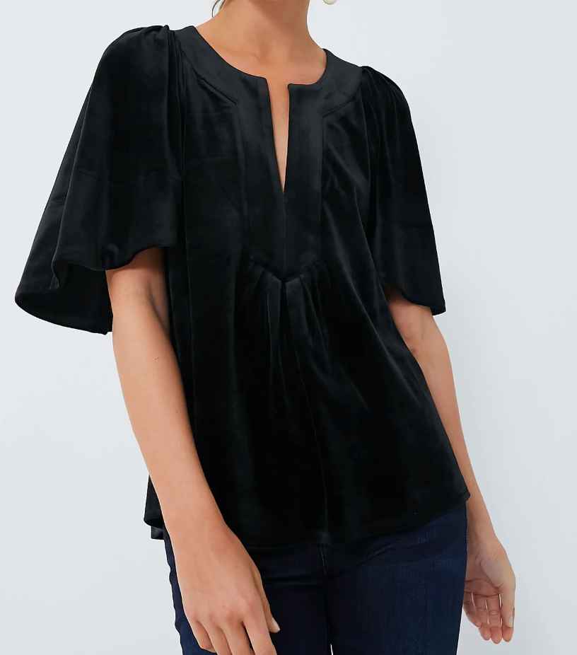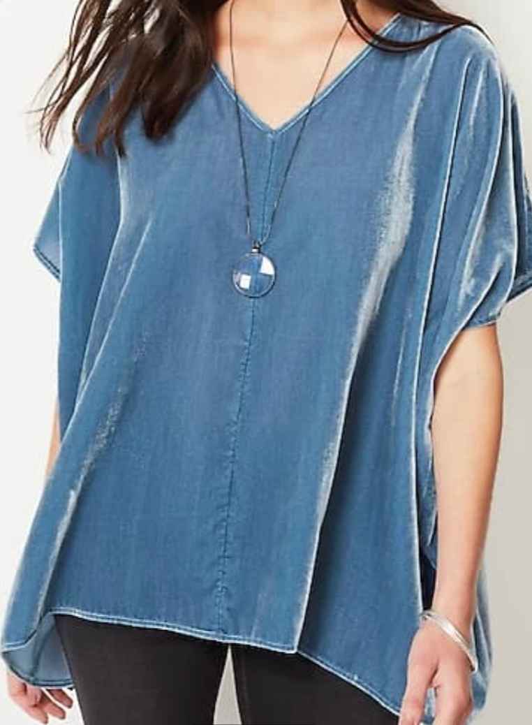 Here, we have some easy pieces like tees and sweatshirts, which are great with leggings and jeans. The button and twist-front top would be great with trousers and a blazer for the office. The sheer shirt would also be great with a skirt suit, or layered over a sleeveless dress to transition those into chillier temps. The black burn-out effect looks great layered over bright colors.