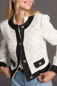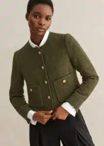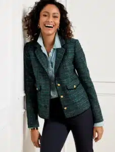 This option from Talbots gives you a polished light layer. Made from elegant tweed with feathery fringe trim, it’s detailed with top stitching, dome shank buttons, and button flap pockets. Basically, it’s just a little bit of fabulous.