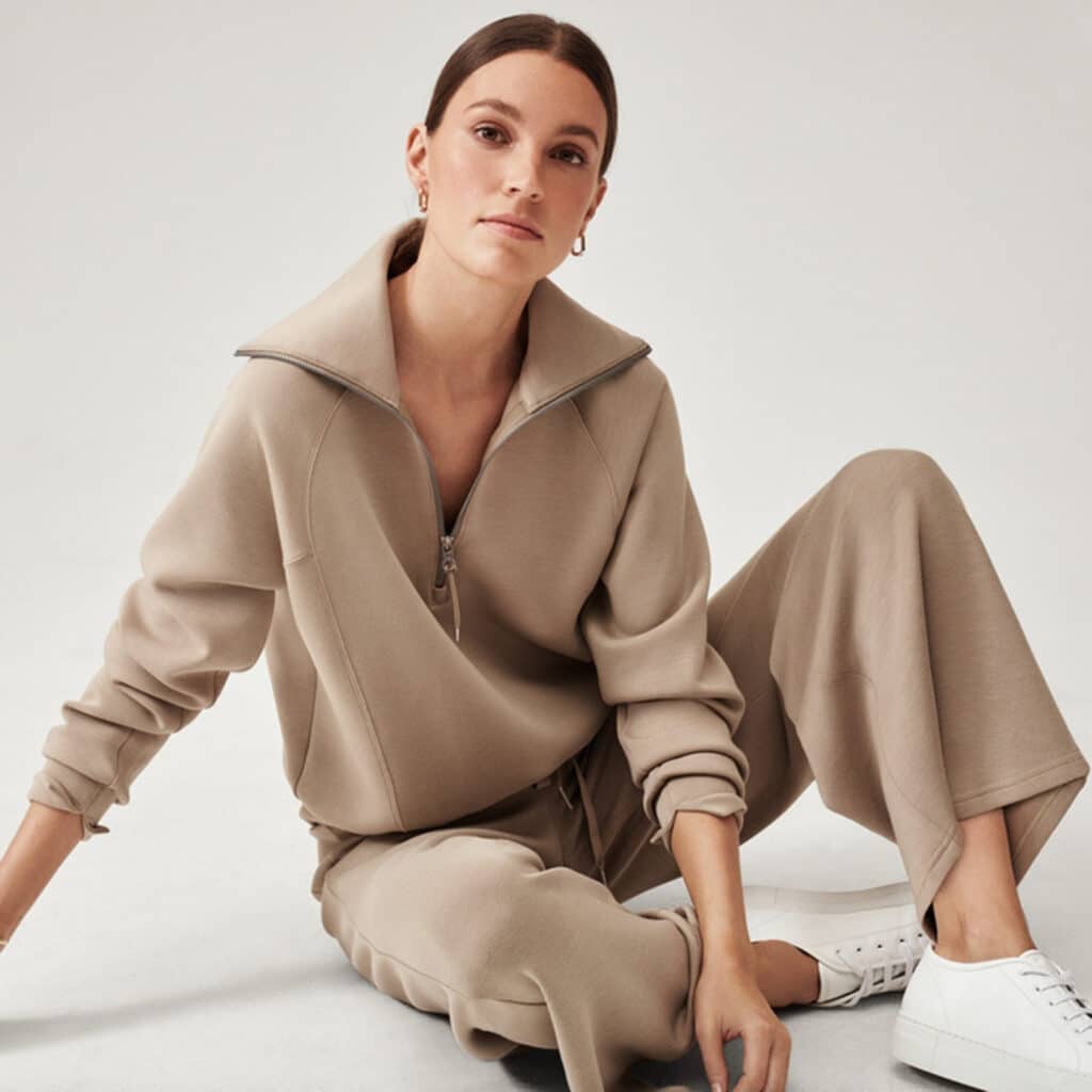 Now that you understand the difference between athleisure and your loungewear, let’s talk about how to level up your lounge look. First, don’t try to pass off pajamas as loungewear. Yes, we know sometimes it’s hard to tell the difference, especially if your pjs are of the cute jogger pant variety. A good rule of thumb: if you wear it in the sheets, don’t wear it in the streets, regardless of how cute it is. Next, don’t confuse loose fitting with baggy. Loose fitting still fits, but it’s less confining and may have roomier legs, an elastic waist, or a longer shirt hem. Baggy is, well, sloppy. Below are a few of our favorite ways to effortlessly elevate your loungewear to fashionable heights without sacrificing comfort.
