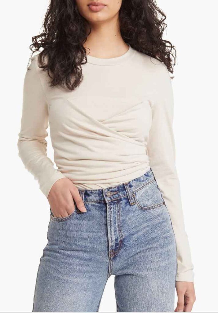 There are several ways to hide those trouble areas, but my favorite is ruching your clothing (this is where the fabric is sewn and gathered). Just be sure it is subtle, as too much will have the opposite effect and add visual weight. Ruching is universally flattering for everyone and can be easily found in many styles and sizes. Whether it’s to one side, over the torso, running the length of the body, or up a sleeve, it not only adds interest and femininity to a garment, but it’s pure magic when it comes to hiding trouble spots.