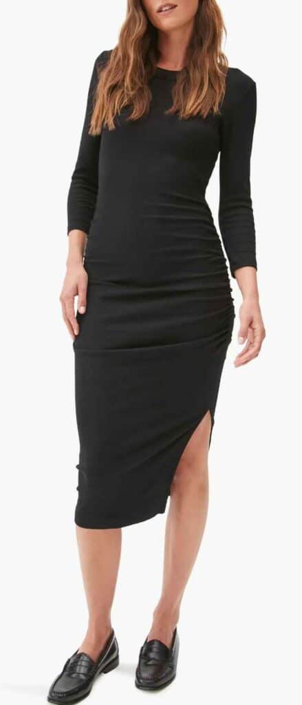 Next is to emphasize your waist. You can use the ruching method (as stated above) or simply ensure that you do not have too much excess fabric hanging around your waist. You can create a strong silhouette by wearing tailored-to-fit clothing that’s not too big or too tight, and you’ll be surprised at how it takes pounds off instantly. You’ll also look more polished and put together, which, some days, is the biggest benefit of all.