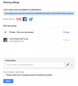 There are several easy ways to share Google MyMaps. If you want to share via Gmail, Facebook and/or Twitter, change the settings from private to your desired level of visibility. If you want to invite specific people, type their email address in the box “Invite people.” You can decide whether or not you allow others to make changes on your map and to invite additional people.